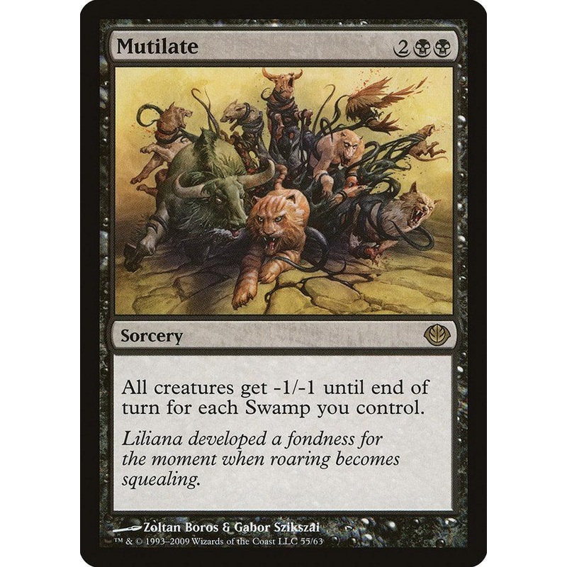 Set: Duel Decks: Garruk vs. Liliana Type: Sorcery Rarity: Rare Cost: {2}{B}{B} All creatures get -1/-1 until end of turn for each Swamp you control. Liliana developed a fondness for the moment when roaring becomes squealing.